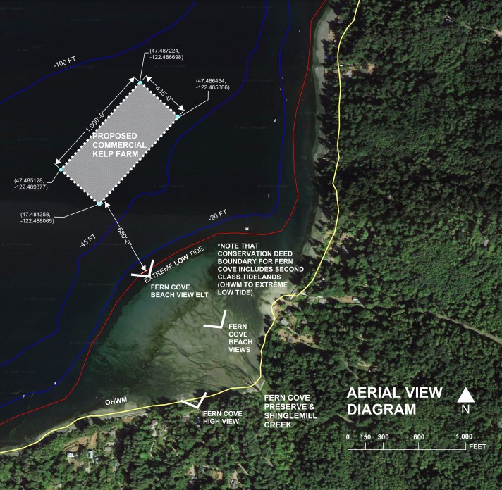 1. If approved, the Vashon Kelp Forest enterprise will install a 10-acre floating grid (the equivalent of 7.5 football fields) about 680 feet from the extreme low-tide shoreline and 1,200 feet from the high-tide shoreline directly in front of the entrance to Fern Cove.